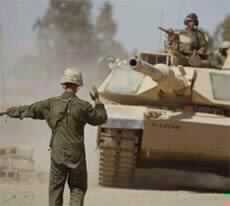 A crewmember of a U.S. Abrams tank directs the vehicle in central Iraq, Saturday, May 10, 2003. (AP Photo/Brennan Linsley)